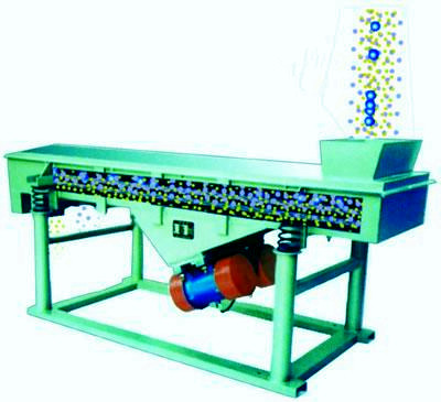 該機(jī)利用振動(dòng)電機(jī)激振作為振動(dòng)源,使物料在篩網(wǎng)上被拋起,同時(shí)向前作直線運(yùn)動(dòng),物料從給料機(jī)均勻地進(jìn)入篩分機(jī)的進(jìn)料口,通過多層篩網(wǎng)產(chǎn)生數(shù)種規(guī)格的篩上物、篩下物、分別從各自的出口排出。