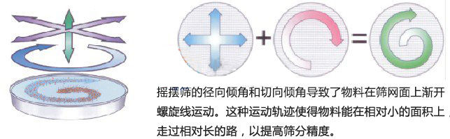 物料在圓形搖擺篩篩面上從中心到外圍擴散,物料均勻在篩面上做跳躍旋轉(zhuǎn)的螺旋運動,無法篩分到下層的物料會在該層面的出料口排出,直至所有物料篩分完畢。工作任務(wù)結(jié)束。